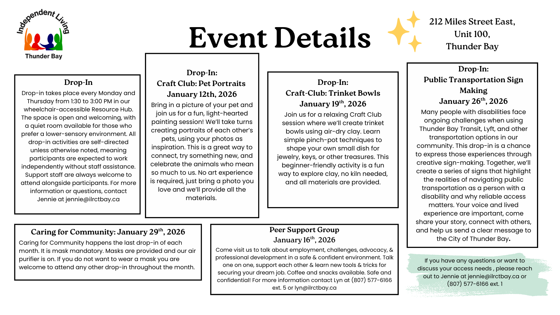 Staff are available to facilitate but cannot provide one-on-one personal support. Participants are welcome to attend with their personal attendant or support worker.